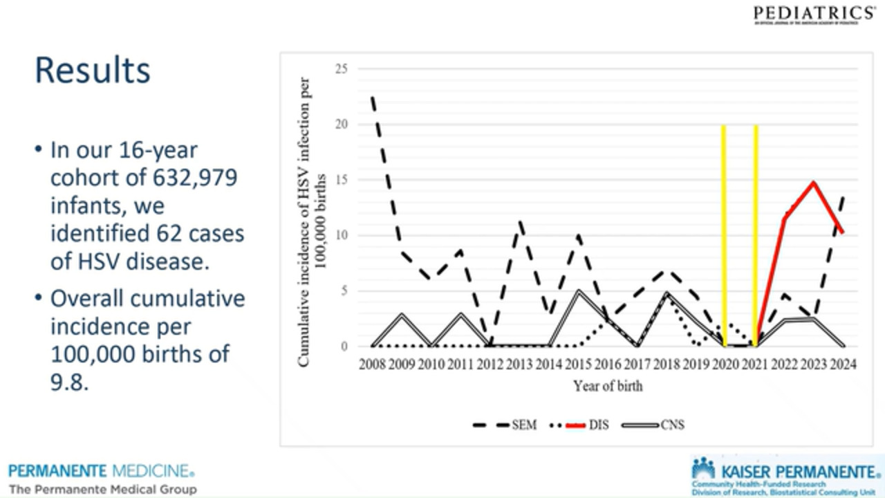 The cumulative incidence of HSV disease was 9.8/100,000 births with a statistically significant rise of disseminated disease from 2021–2024.