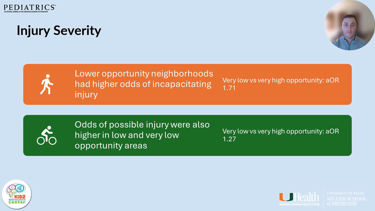Lower opportunity neighborhoods show higher pediatric pedestrian and bicyclist injury rates, greater severity, and more hazardous crash contexts across Childhood Opportunity Index levels.